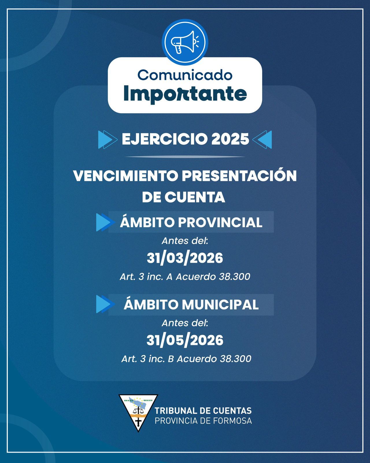 Publicado el marzo 12, 2026marzo 12, 2026 por Atención organismos Provinciales Municipalidades y Comisiones de Fomento Se acercan los vencimientos para la presentación de la Cuenta Anual Ejercicio 2025. 🗓 Provincial antes del: 31/03/2026 . 🗓 Municipal antes del: 31/05/2026 . Plazos establecidos por el Acuerdo Nº 38.300 .